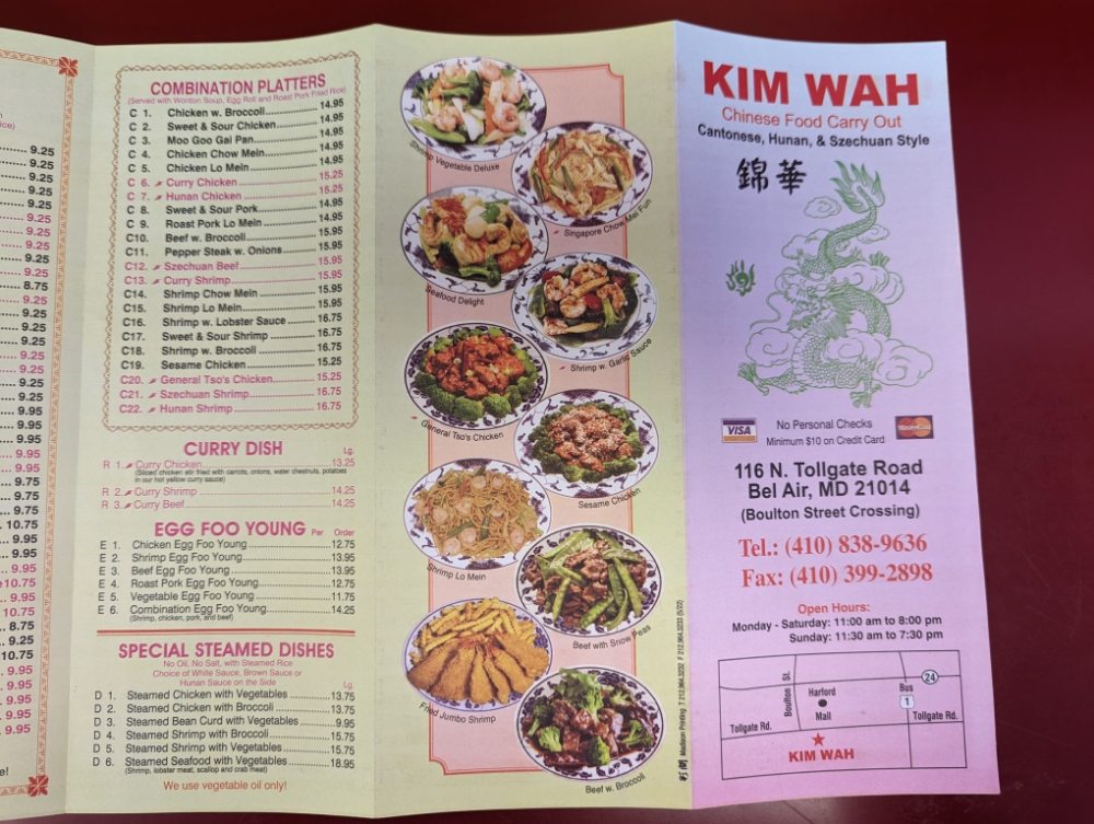 Kim Wah is a Chinese restaurant in Bel Air, MD, known for its family-like atmosphere and customizable orders. With a diverse menu and large portions, customers love the fresh, delicious food and excellent service. Popular dishes like Sesame Chicken, egg rolls, Steamed Dumplings, and Special Wonton Soup have received high praise. The restaurant offers takeout, delivery, and can accommodate large orders for parties. While slightly more expensive, the quality and taste make it worth it for many patrons. Kim Wah's wait staff is attentive, making dining experiences enjoyable. The establishment also provides outdoor seating and a private parking lot for convenience. Overall, Kim Wah stands out as one of the best Chinese restaurants in the area, combining great food, friendly service, and a welcoming atmosphere.